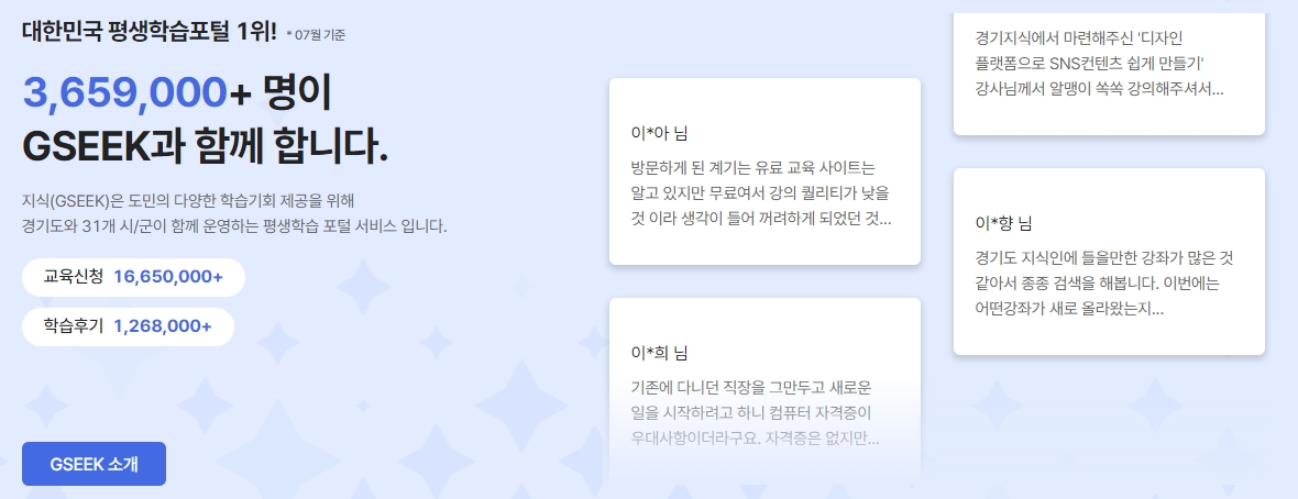 7. GSEEK의 인기 있는 강좌는 무료로 제공되며, 교육 신청 수와 학습 후기 수를 통해 강의의 신뢰도와 품질을 확인할 수 있습니다. 많은 사용자들이 이미 이 포털을 통해 만족스러운 학습 경험을 하고 있습니다.