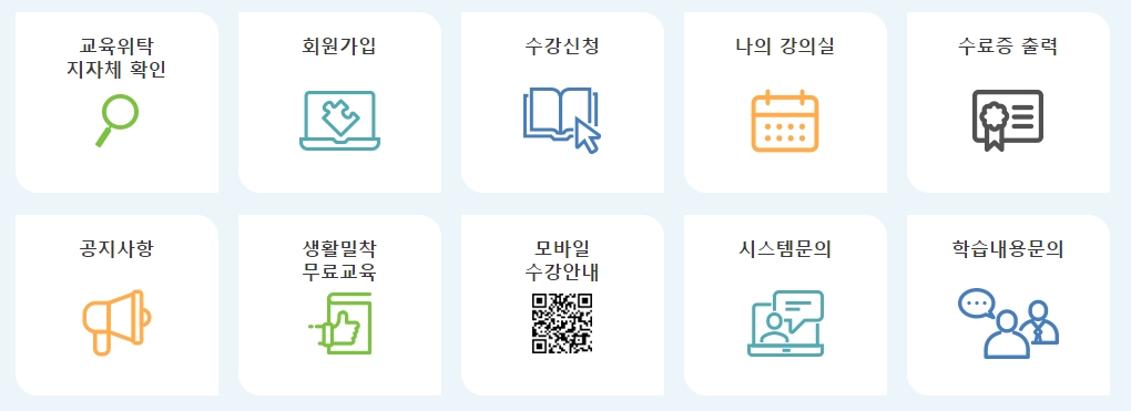 3. 홈페이지 중앙에는 교육위탁 지자체 확인, 수강 신청, 나의 강의실, 수료증 출력, 공지사항, 생활밀착 무료교육, 모바일 수강 안내, 시스템 문의, 학습내용 문의 등의 다양한 기능과 서비스가 아이콘 형태로 제공됩니다. 이를 통해 사용자는 자신이 필요한 정보를 쉽고 빠르게 접근할 수 있습니다.