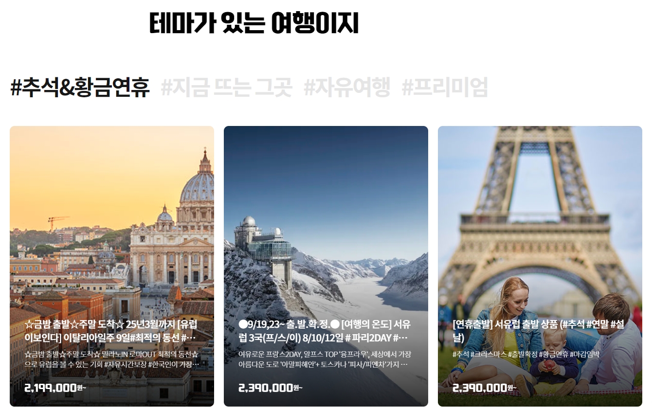7. 테마가 있는 여행지 코너에서는 추석이나 황금연휴 같은 특정 시기를 타겟으로 한 상품을 제안합니다. 유럽이나 알프스, 파리 등 인기 있는 테마 여행 상품이 제공되며, 상세 설명과 함께 예약을 유도하고 있습니다.