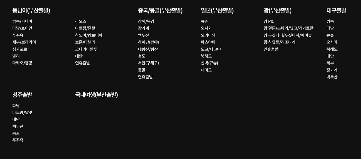 4. 지방 출발 여행 상품도 제공하며, 부산 출발, 청주 출발, 대구 출발 등 다양한 출발지 옵션을 갖추고 있어 지방에 거주하는 고객들도 편리하게 이용할 수 있도록 설계되었습니다. 예를 들어, 부산 출발 여행에서는 동남아, 중국/몽골, 일본, 괌 등 여러 여행지 선택지가 제공됩니다.