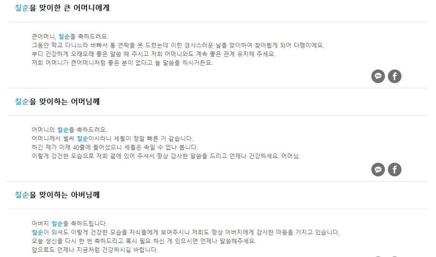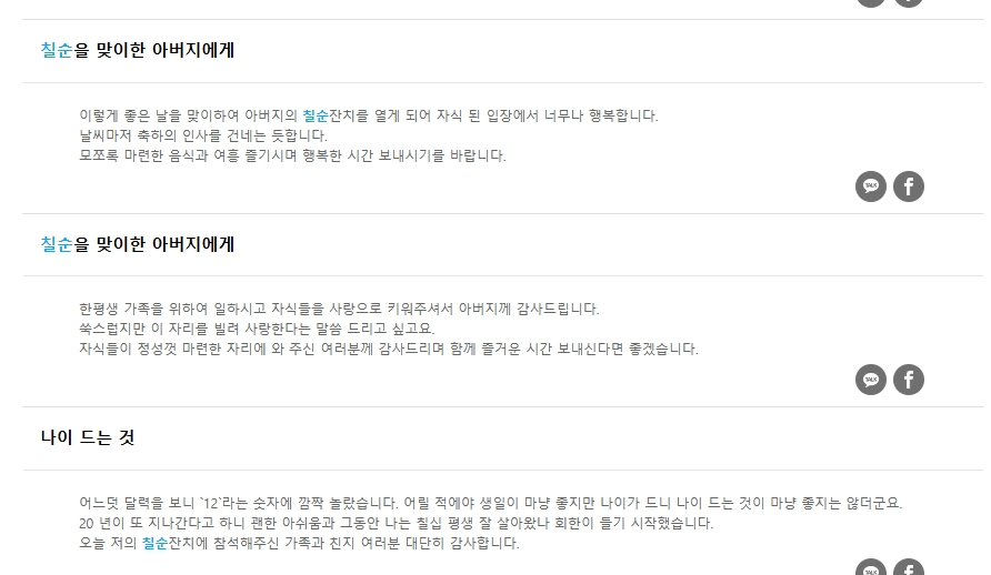 5. 특히 부모님께 직접 전하는 인사말도 있어서 진심을 담은 메시지를 전하고 싶은 분들께 참 좋아요. ‘칠순을 맞은 아버지께’ 같은 제목의 글을 보면 뭉클한 구절이 많고요, 가족 간의 따뜻한 마음이 느껴져요.