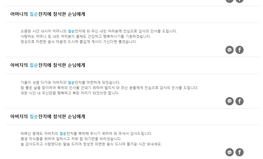 3. 상단 검색창에 ‘칠순’이라고 입력하고 검색 버튼을 눌러보세요. 그러면 고희연과 관련된 인사말 예문들이 쭉 나와요. 정갈하고 감동적인 문장들이 많아서, 어떤 문장을 골라야 할지 고민될 정도랍니다.