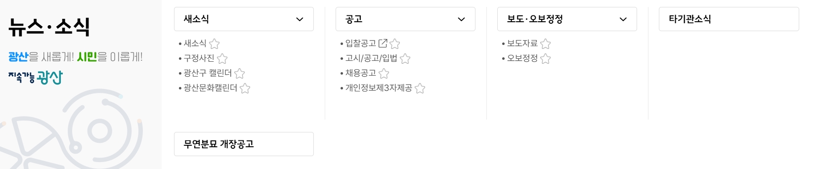 7. ‘광산플랫폼’이라는 특화 페이지도 꼭 둘러보세요. 보건소나 동 행정복지센터 등 구청 소속 기관으로 연결되는 경로가 모여 있고, 주민편의 서비스를 빠르게 찾아갈 수 있도록 만들어져 있어요. 특히 문화예술과 지역경제 관련 정보도 이곳에서 소개돼요.