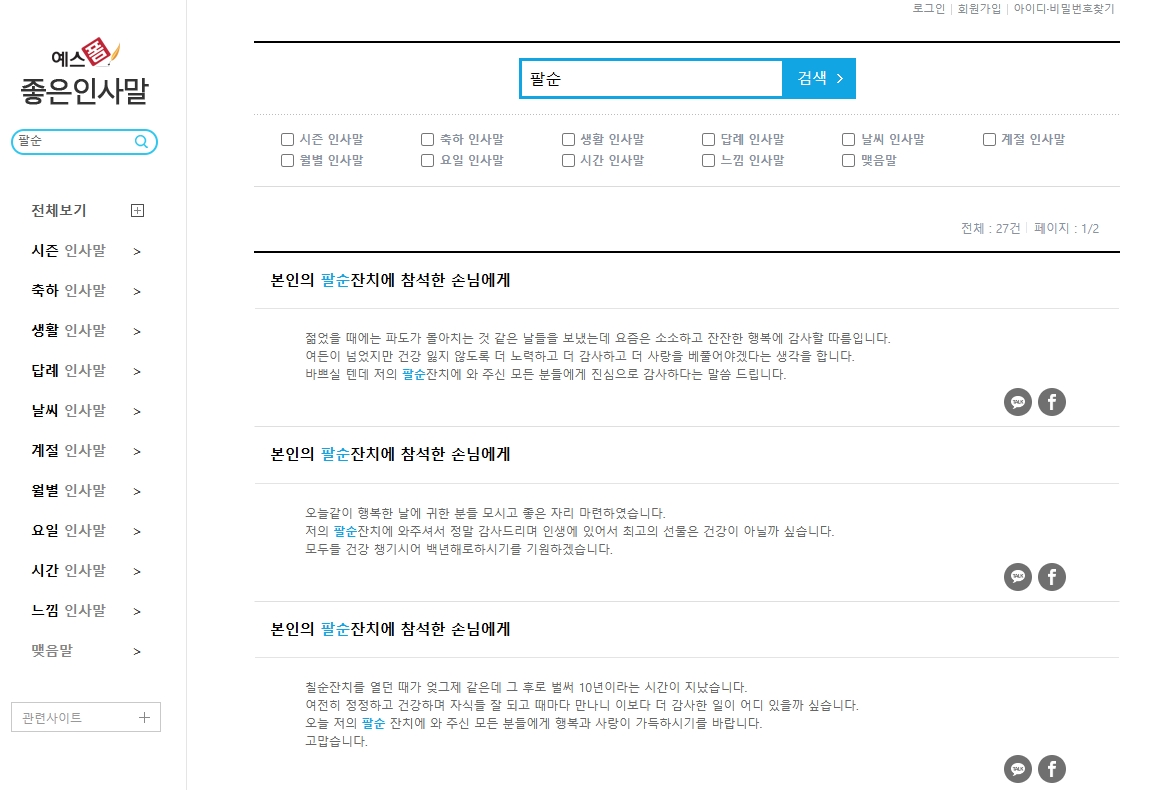 2. 왼쪽 메뉴 중에서 ‘인사말’ 카테고리를 클릭해보세요. 그 안에 ‘축하 인사말’이라는 항목이 있는데요, 이 부분에서는 생일, 승진, 퇴임, 결혼 등 다양한 주제별 축하 문구들이 정리돼 있어서 아주 보기 쉽게 되어 있답니다. 필요할 땐 복사해서 바로 사용할 수도 있어서 정말 편리해요.