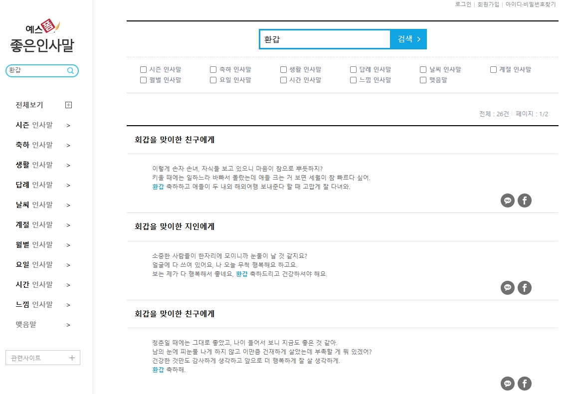 4. ‘환갑’을 검색해도 좋은 문구들이 많이 나옵니다. 꼭 정확하게 구순이라는 키워드가 아니어도, 예문 자체가 워낙 잘 되어 있어서 조금만 바꾸면 얼마든지 응용이 가능하거든요. 가족이나 친척, 또는 지인분께 따뜻한 마음을 전하고 싶을 때 아주 유용하게 쓰실 수 있어요.
