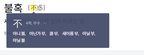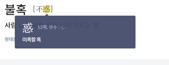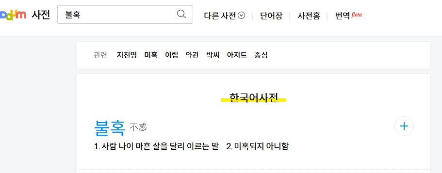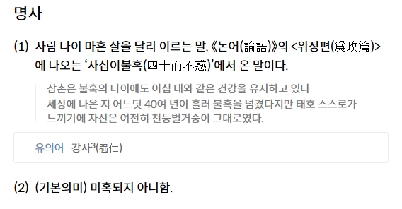 2. 검색창에 불혹을 입력해 보시면, 단어의 기본 의미와 함께 유래까지 확인할 수 있어요. 단순히 나이를 나타내는 게 아니라, 마음이 흔들리지 않는다는 깊은 뜻이 있다는 걸 알 수 있어서, 다시 한번 생각해보게 되더라고요.