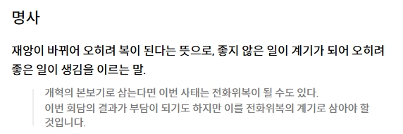 4. 정의 부분을 꼼꼼히 읽어보세요. 단순히 좋은 말이다~로 끝나는 게 아니라, 어떤 상황에서 이 표현을 쓰는 게 맞는지도 이해할 수 있어요. 예를 들어 위기 상황 속에서 쓰면 정말 적절하겠죠?