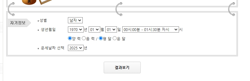 5. 모든 정보를 입력한 다음에는 운세 날짜를 지정해줍니다. 예를 들면, 2025년으로 설정하고 결과 보기 버튼을 누르면 끝! 버튼 하나만 누르면 올해 전체에 대한 운세를 간단히 확인할 수 있어서 너무 간편합니다.