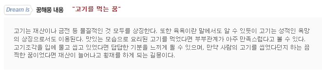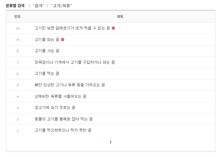 4. 예를 들어 고기라는 키워드를 선택하면 고기를 먹는 꿈, 파는 꿈, 사는 꿈 등 다양한 상황별 꿈풀이가 정리돼 있어요. 내용에 따라 해석이 다르게 나타나기 때문에 자신이 꾼 상황과 최대한 비슷한 내용을 찾아보는 게 좋겠죠?
