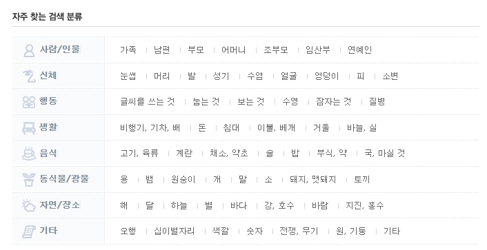 3. 꿈해몽 페이지를 보면 사람, 동물, 장소, 감정, 행동 등으로 세세하게 카테고리가 나눠져 있어요. 본인이 기억하는 꿈의 주요 요소를 떠올려서 해당 카테고리를 클릭하면 관련된 꿈풀이 리스트가 한눈에 정리되어 나오니 아주 편해요.