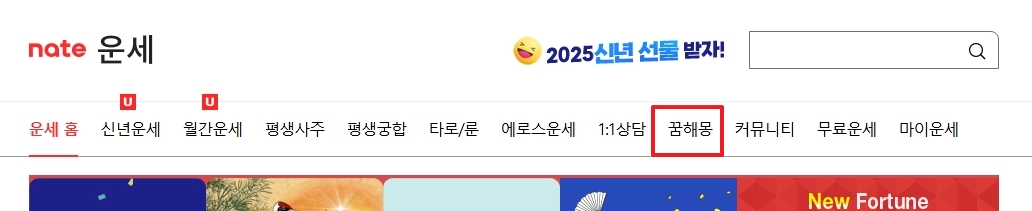 1. 네이트 운세 페이지에 접속하면 다양한 운세 서비스를 접할 수 있어요. 그 중에서도 꿈해몽 항목은 자신이 꾼 꿈을 키워드로 찾아보거나 분류된 주제별로 쉽게 확인할 수 있도록 구성돼 있어서 누구나 부담 없이 접근할 수 있답니다.