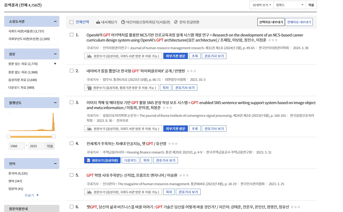 검색 결과가 너무 많다면 검색창 옆에 있는 고급 검색 메뉴를 클릭해 보세요 발행 연도, 저자, 발행 기관 같은 조건을 설정할 수 있고 키워드를 AND·OR·NOT 연산자로 조합해 범위를 좁힐 수도 있습니다