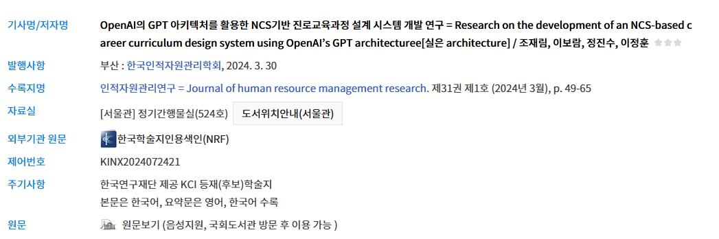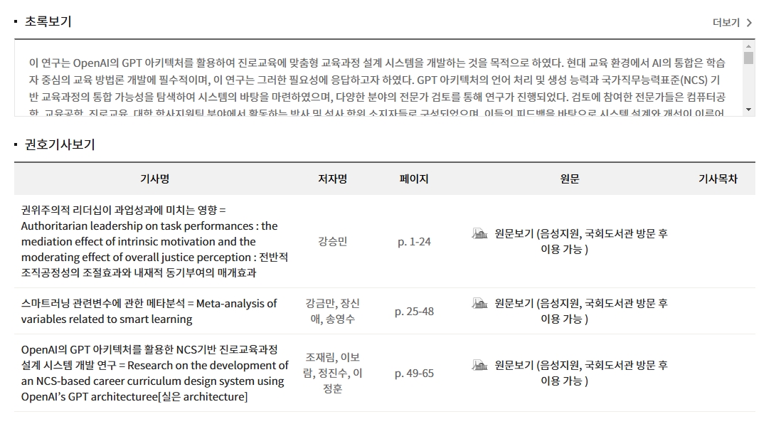 4. 관심 있는 자료를 클릭하면, 저자명, 발행연도, 발행기관, 주제어 같은 세부 정보가 나옵니다. 특히 어떤 경로로 자료를 볼 수 있는지도 여기서 확인할 수 있는데요, 예를 들면 원문보기 가능, 도서관 방문 열람 같은 표시가 함께 나오니 열람 방법을 미리 체크해두시면 좋아요.