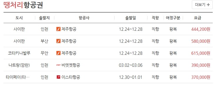 5. 항공권 특가 페이지에서는 사이판, 코타키나발루, 나트랑 같은 인기 노선을 저렴하게 구매할 수 있어요. 예를 들어, 인천-사이판 왕복 항공권을 제주항공으로 44만 원대에 예약할 수 있습니다. 항공사, 출발지, 목적지, 날짜 같은 정보도 한눈에 보기 좋게 정리되어 있어요.