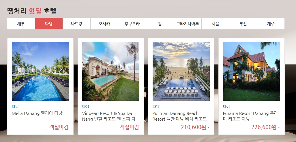 6. 호텔과 리조트 예약 메뉴에서는 다낭, 세부, 후쿠오카 같은 지역 숙소를 할인가로 예약할 수 있어요. Melia Danang 같은 고급 리조트도 저렴하게 예약할 수 있고, 사진과 가격, 객실 정보가 자세히 나와 있어서 원하는 숙소를 쉽게 고를 수 있습니다. 인기 지역은 객실 마감이 빠르니 서두르는 게 좋아요.