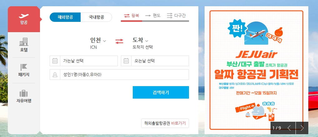 2. 홈페이지에 들어가면 왼쪽에 항공권, 호텔, 패키지여행, 자유여행 같은 카테고리가 정리돼 있어요. 원하는 항목을 클릭해서 조건을 입력하면 바로 검색할 수 있습니다. 항공권은 해외, 국내로 나뉘고 왕복, 편도, 다구간 등 선택도 가능해서 내가 필요한 항공편을 빠르게 찾을 수 있습니다.
