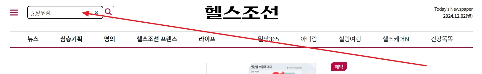 눈 밑 떨림과 관련된 정확한 건강 정보를 얻으려면 헬스조선 홈페이지를 참고하는 것이 좋습니다. 검색창에 '눈 밑 떨림'을 입력하면 다양한 원인과 예방법에 관한 전문적인 기사들을 확인할 수 있습니다.2. 검색창 이용법