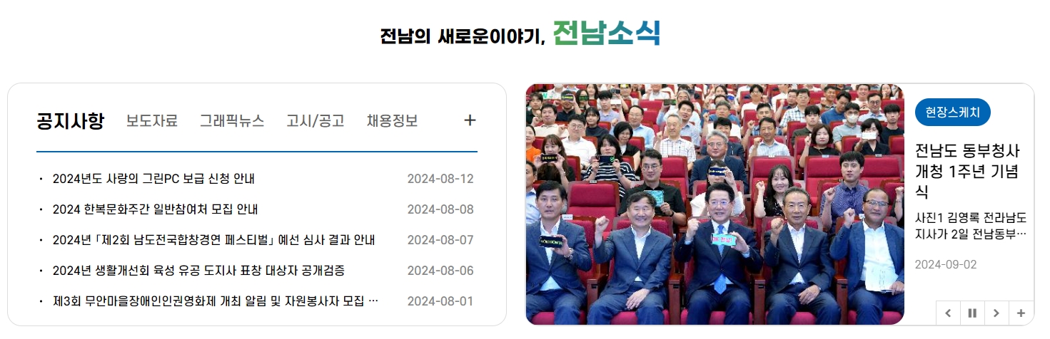 2. 전라남도의 공지사항 및 소식을 한눈에 볼 수 있는 메뉴에서는 도민과 방문객 모두가 필요한 정보를 얻을 수 있습니다. 예를 들어, 공공 정책 발표, 채용 공고, 지역 축제 안내와 같은 실용적이고 흥미로운 내용들이 포함되어 있습니다.