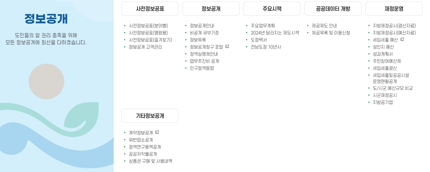 5. 정보공개 메뉴에서는 행정 투명성을 위한 다양한 자료들을 열람할 수 있습니다. 사전정보공개, 재정운영 현황, 공공데이터 개방 등 모든 공공 정보를 투명하게 공개하여 도민들의 알 권리를 충족시키고 있습니다.