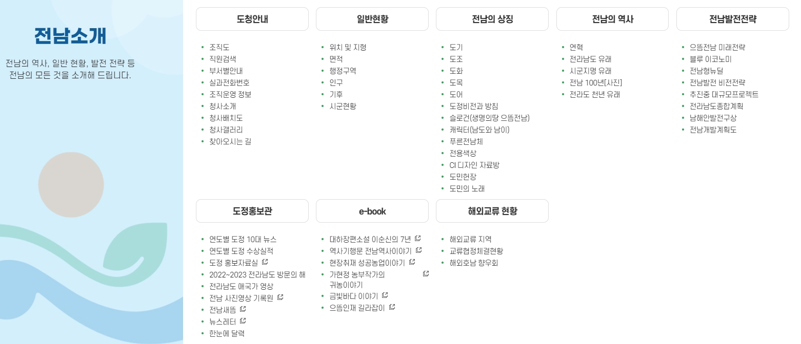 8. 전남을 소개하는 메뉴에서는 전라남도의 역사와 문화, 상징, 발전 전략 등 지역의 전반적인 정보를 제공하여 전남에 대한 이해를 돕고 있습니다. 지역의 매력을 알리고 전남을 더욱 특별하게 느낄 수 있도록 돕는 콘텐츠가 준비되어 있습니다.