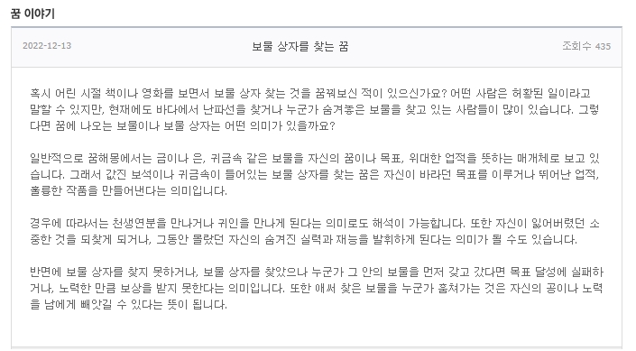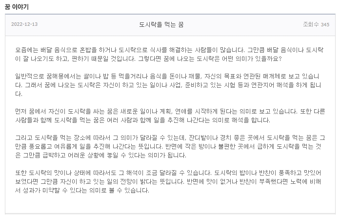 '꿈 이야기' 섹션에서는 도시락을 먹는 꿈, 보물 상자를 찾는 꿈 등 구체적인 사례 중심의 해석을 제공합니다. 실제 사례를 통해 해석을 더 명확히 이해할 수 있어요.