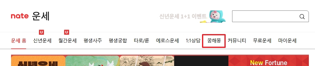검색창 아래쪽의 '운세' 버튼을 누르면, 다양한 운세 메뉴가 나타납니다. 여기서 '꿈해몽' 항목을 선택하면 관련된 해석 페이지로 이동할 수 있습니다.