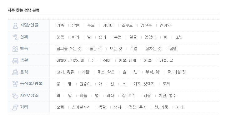 꿈해몽 페이지에 들어가면 사람, 음식, 장소 등 다양한 카테고리로 나뉜 분류 목록이 제공됩니다. 자신의 꿈 내용과 가까운 분류를 선택해 관련 해석을 쉽게 찾을 수 있어요.