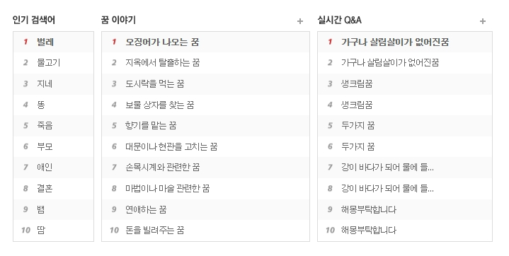 페이지 상단에는 인기 검색어가 나와 있어서 다른 사람들이 자주 찾는 꿈의 의미를 간단히 살펴볼 수 있습니다. 빠르게 참고하고 싶을 때 유용하죠.
