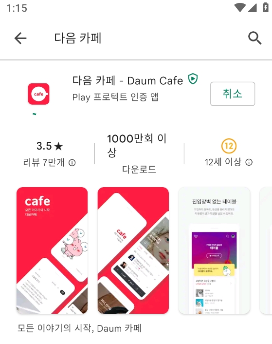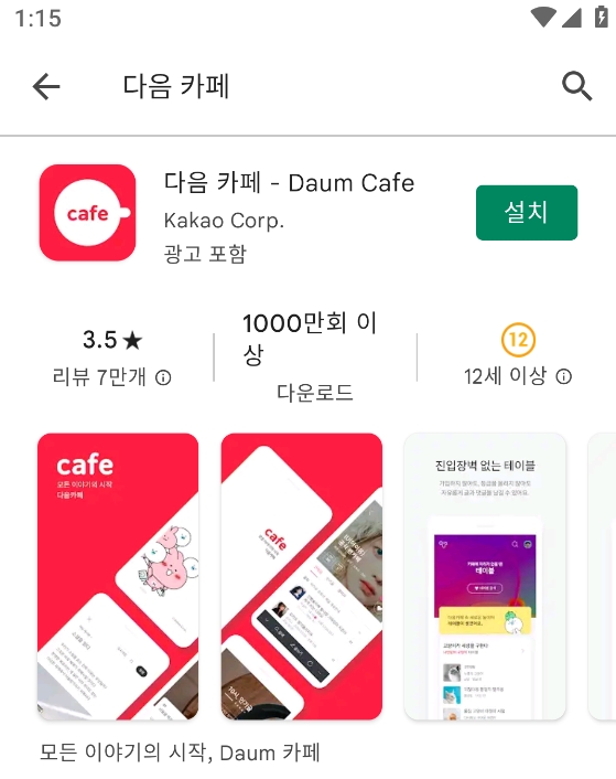 상단 검색창을 눌러 ‘다음 카페’라고 입력하면, 관련된 공식 앱이 검색 결과에 바로 나옵니다. 아이콘과 이름을 잘 확인한 후 설치 진행하세요.