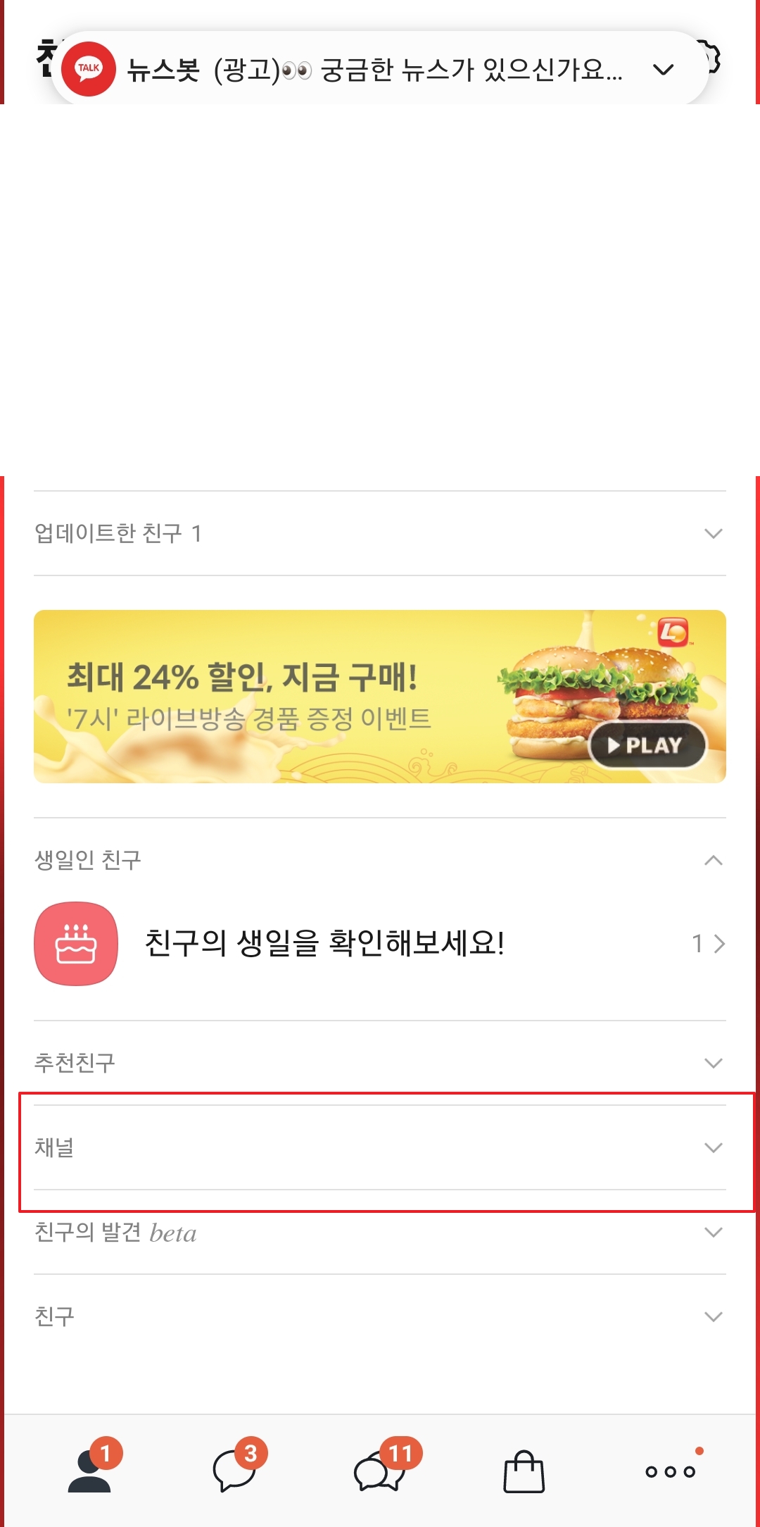 친구 목록에서 해당 채널을 클릭하고, 하위 메뉴가 열리면 다시 한 번 채널 이름을 눌러 상세 페이지로 이동합니다.