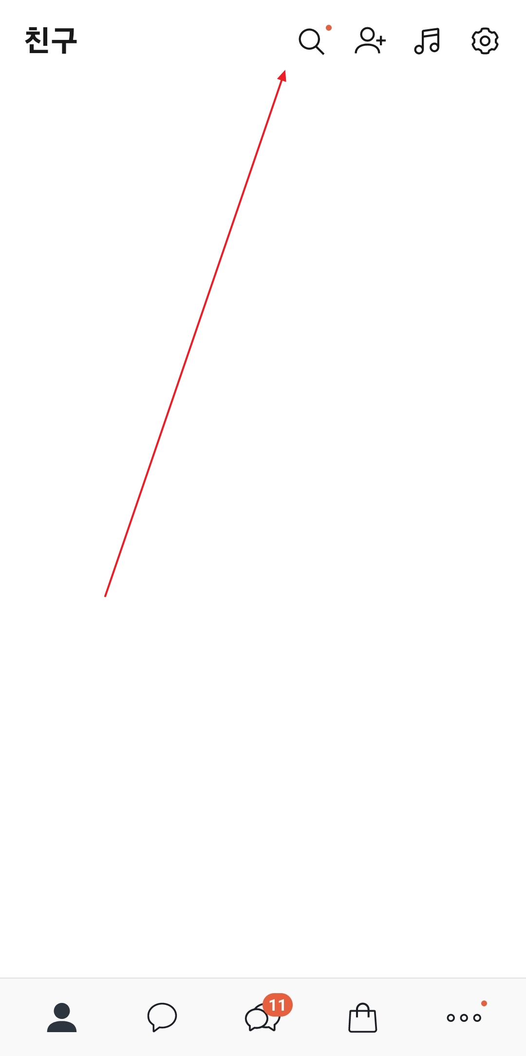 카톡을 실행한 뒤 우측 상단 돋보기 버튼을 눌러 '뉴스봇'을 검색합니다. 정확한 채널명을 입력해야 원하는 채널을 쉽게 찾을 수 있습니다.
