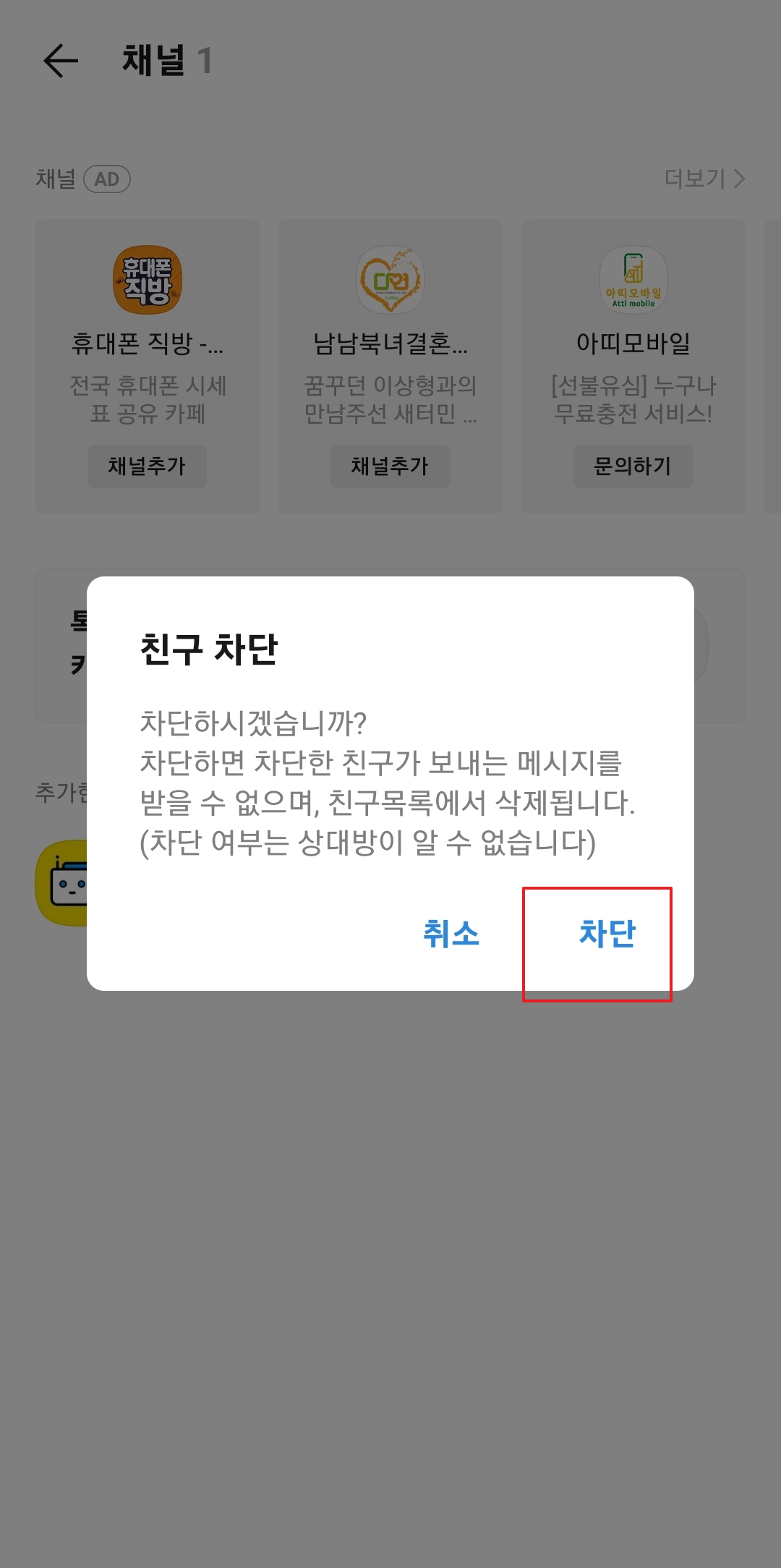 채널을 길게 누르면 메뉴가 뜨고, 여기서 '차단'을 선택해주면 됩니다.