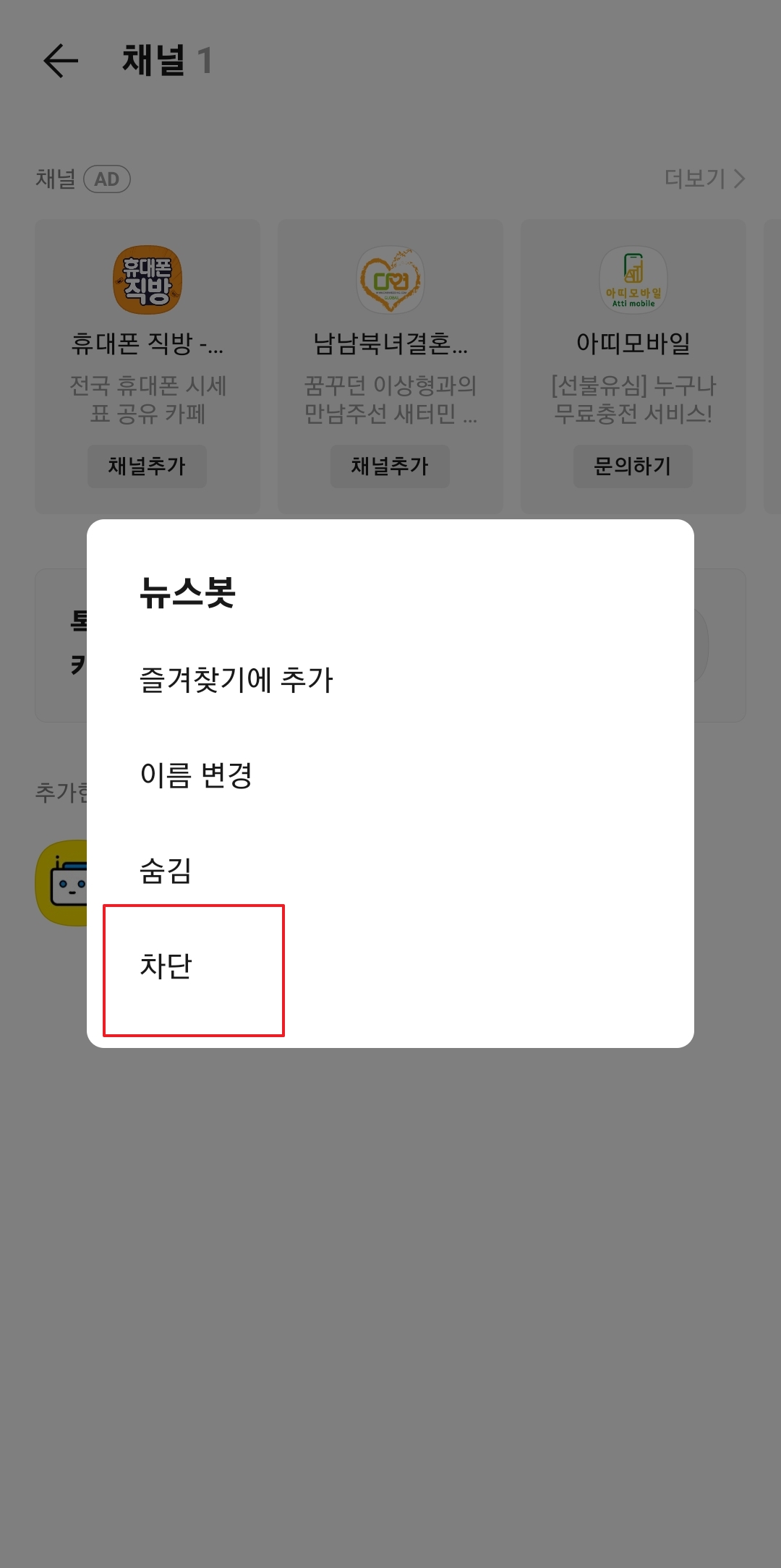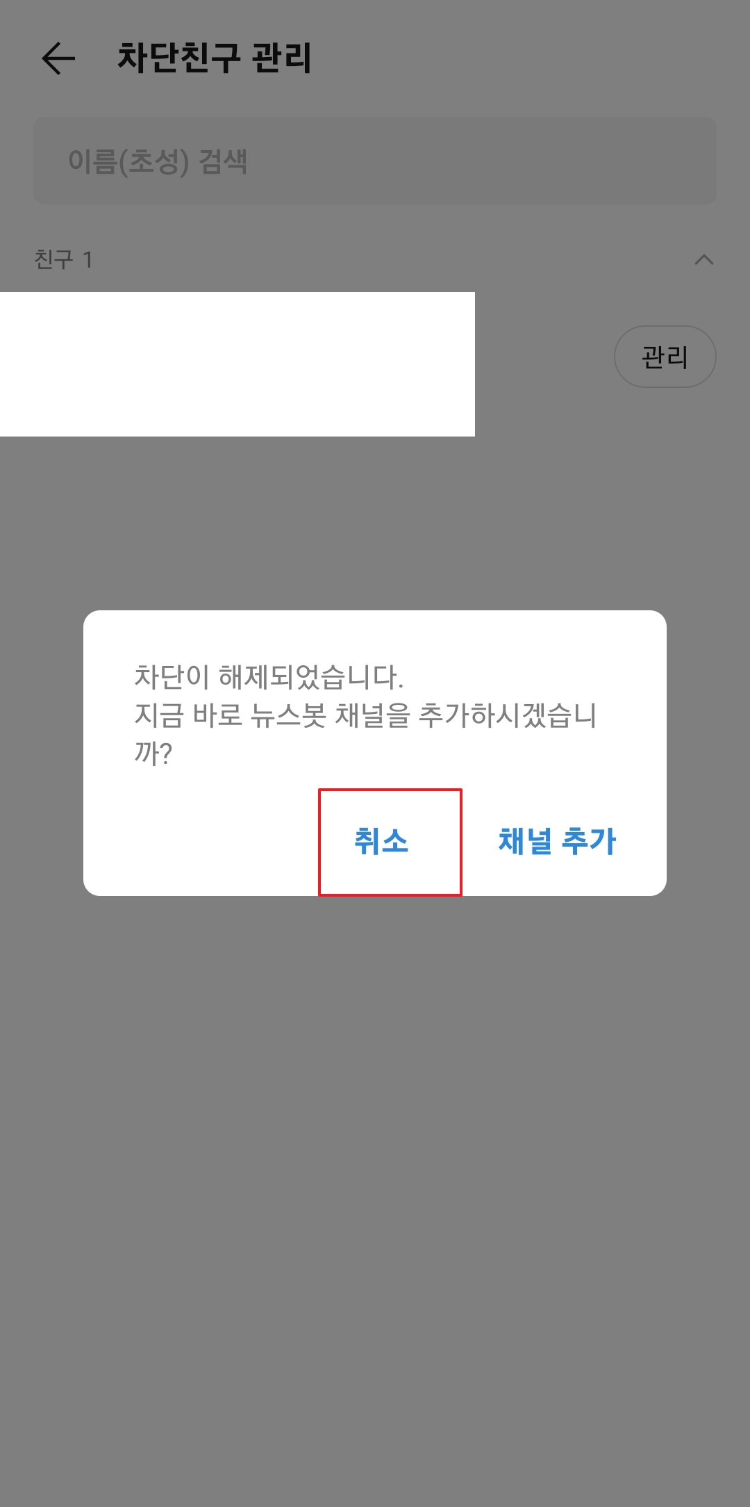 차단 해제 후 채널 추가 취소를 하면 해당 뉴스봇이 친구 목록에서 삭제되며, 앞으로 메시지를 받지 않게 됩니다.