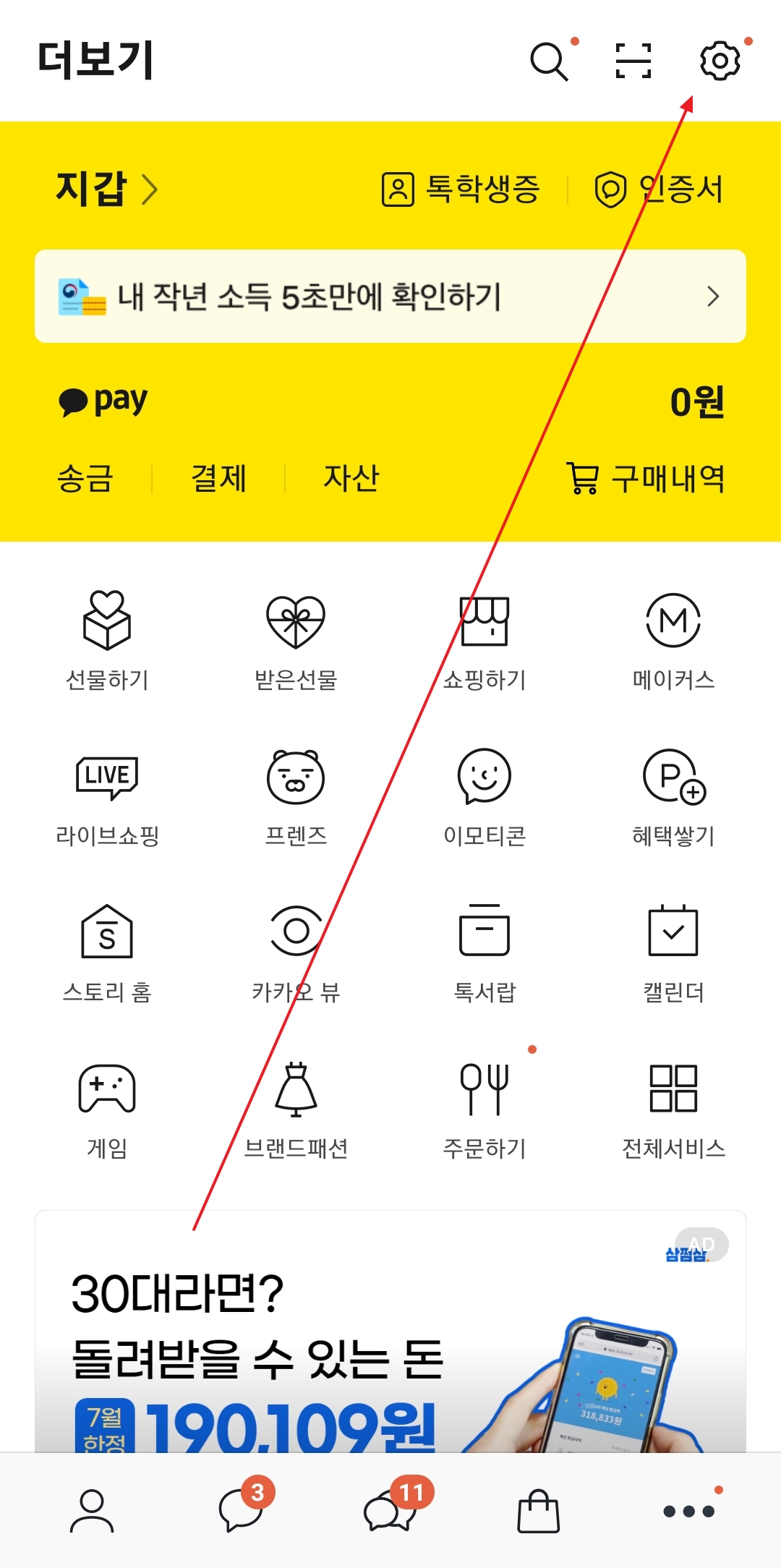 더보기 메뉴(점 3개)를 클릭한 뒤, 톱니바퀴 버튼을 눌러 설정으로 들어갑니다.