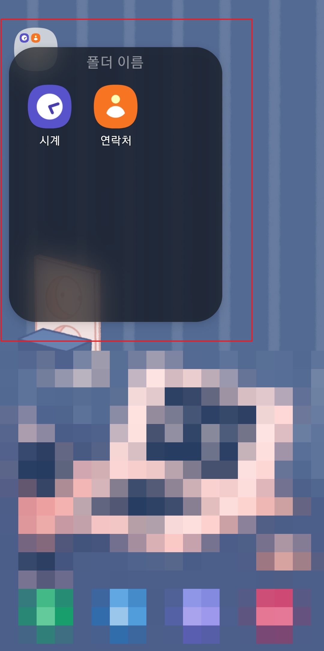 회색 테두리가 생긴 상태에서 손을 떼면 자동으로 새로운 폴더가 생성됩니다. 이때 어플 위치는 드래그했던 어플이 두 번째, 고정된 어플이 첫 번째 자리에 위치하게 되며, 원하면 길게 눌러서 순서를 바꿀 수 있습니다.