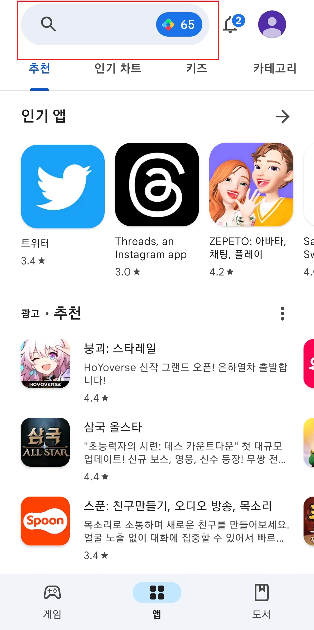 휴대폰 기본 Play 스토어를 열고 상단 검색창을 누릅니다. 구글 인증 스토어를 이용하면 악성 앱을 피하고 최신 버전을 안전하게 받을 수 있습니다.