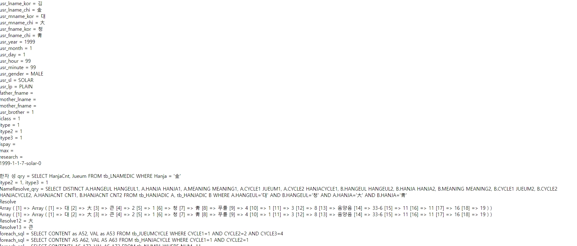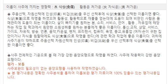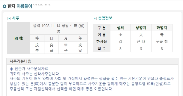 7. 입력된 이름과 생일 정보를 바탕으로 사주 분석 결과가 화면에 표시됩니다. 단 예시 결과는 테스트용으로 실제 풀이 시 정확한 정보를 다시 입력해야 합니다.