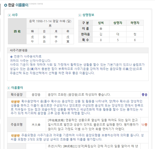 9. 상단 옵션에서 한글 이름풀이로 전환하면 한자 대신 한글 자획 수와 음양오행 원리로 결과를 확인할 수 있습니다. 단 분석 기준이 다르므로 한자 풀이와 비교해보는 것을 권장합니다.