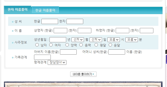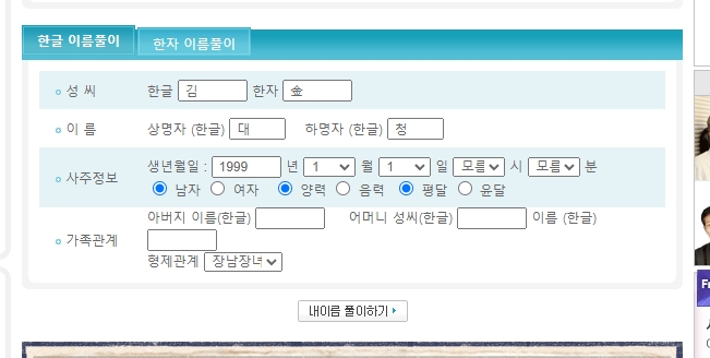 3. 한자 이름풀이 입력 화면에 생년월일과 성, 이름, 성별, 양력 항목을 빠짐없이 입력해야 정확한 결과를 받을 수 있습니다. 입력 칸 오작동 시에는 페이지를 새로고침하거나 브라우저 하단으로 스크롤하여 숨겨진 입력 창을 확인하세요.