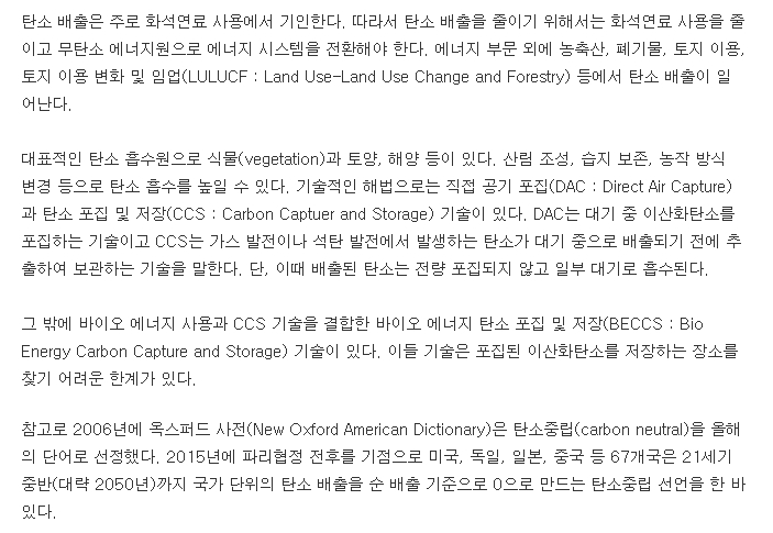 2. 검색 결과에서 탄소중립의 개념부터 실제 적용 사례까지 다양한 정보가 단계별로 정리되어 있어요. 예를 들어, 기본 개념은 무엇인지, 왜 중요한지, 어떤 기술들이 쓰이는지 등 각 항목이 체계적으로 구성되어 있어서 처음 접하는 사람도 이해하기 쉬워요. 정책, 산업계 대응, 국제 흐름까지 확인할 수 있어 깊이 있는 정보 탐색이 가능합니다.