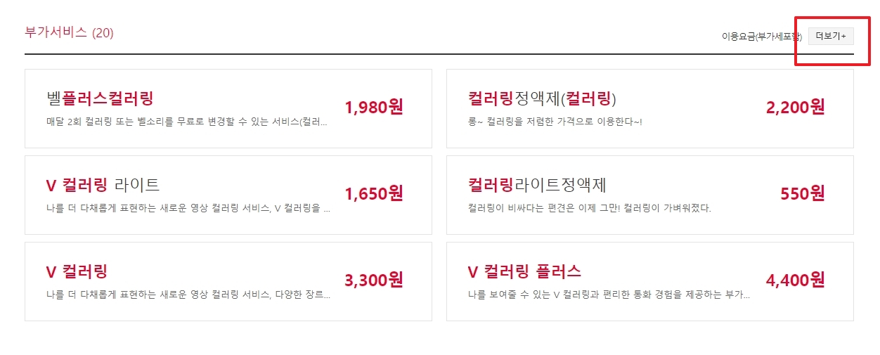 이제 부가서비스 항목이 나옵니다. 컬러링은 기본적으로 부가서비스에 속하기 때문에 이곳에서 확인할 수 있고, 보통 20여 개 항목이 보이는데, '더보기'를 눌러야 전체 항목이 다 나타납니다.
