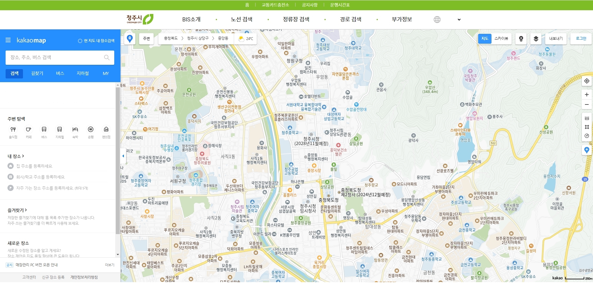 청주 버스정보시스템 홈페이지(www.dcbis.go.kr)는 실시간 날짜와 날씨 정보, 노선·정류장 검색, 경로안내, 분실물 찾기, 공지사항, 운행 시간표와 요금표 등을 제공하며 카카오맵 연동을 통해 빠르고 정확한 버스 이용을 지원합니다.