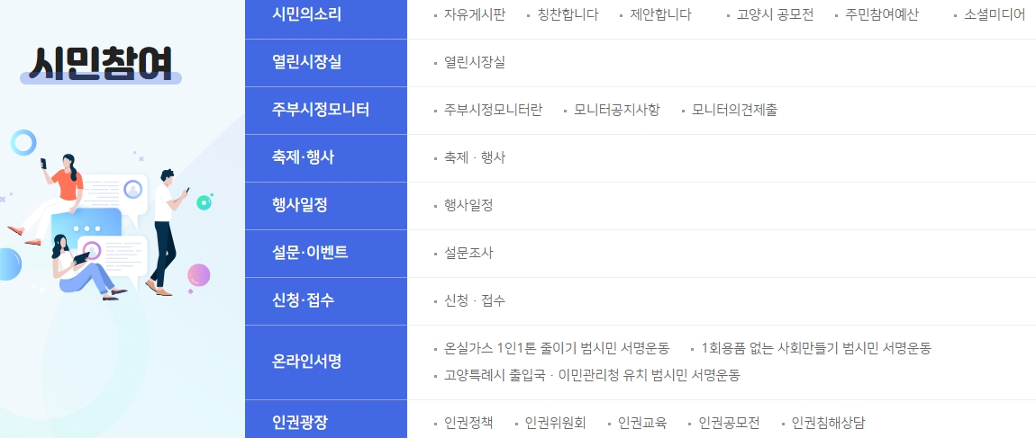 2. 홈페이지에서 가장 돋보이는 기능 중 하나는 시민들의 참여를 독려하는 다양한 프로그램입니다. 이를 통해 시민들은 설문 조사, 행사 신청, 봉사 활동 등 다양한 참여 기회를 접할 수 있으며, 고양시의 발전에 기여할 수 있습니다. 이러한 플랫폼은 시민들의 의견을 반영하여 더욱 살기 좋은 도시를 만들기 위한 중요한 역할을 하고 있어요.