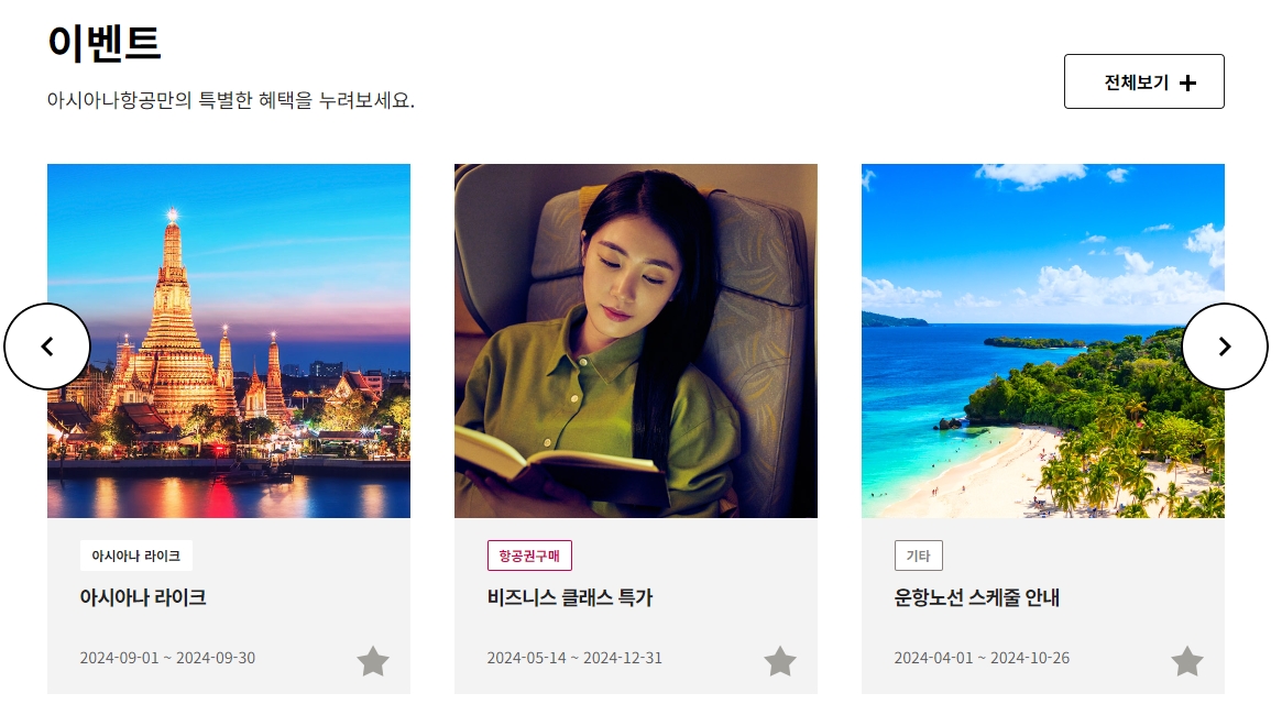 아시아나항공 홈페이지에서는 예약, 여행 준비, 수하물 안내, 마일리지 적립과 사용, 기내 서비스, 이벤트 소식 등 항공 여행 정보를 직관적인 메뉴로 빠르고 쉽게 확인하고 이용할 수 있으며 모바일과 PC 버전 모두 지원되어 언제 어디서나 편리하게 항공편 조회와 예약이 가능합니다.