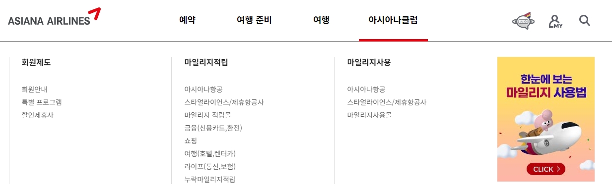 1. 공식 홈페이지에 접속하시면 상단 메뉴에서 예약, 여행 준비, 아시아나클럽 등을 직관적으로 확인할 수 있습니다.