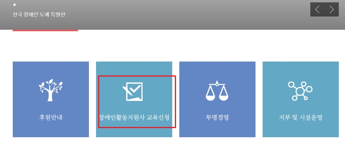 홈페이지 메뉴를 찬찬히 살펴보니 장애인활동지원사 교육신청이라는 글씨가 바로 눈에 띄더라고요. 그래서 바로 그 메뉴를 눌러서 들어가 봤습니다.