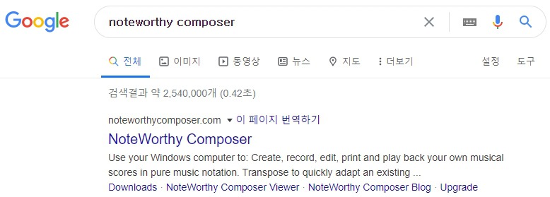 가장 먼저 nwc 2.75 한글판 다운로드를 위해서 우리가 자주 쓰는 검색엔진에서 'noteworthy composer'라고 검색을 해보세요. 그러면 여러가지 검색 결과가 나올텐데요, 그중에서 공식 홈페이지처럼 보이는 곳으로 들어가주시면 됩니다. 보통은 제일 위에 나오니까 찾기 쉬울거에요. 이렇게 공식 자료실로 들어가야 안전하게 파일을 받을 수 있거든요.