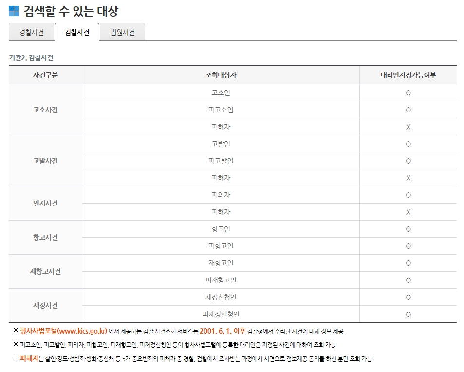 검찰 사건을 조회할 때는 아무나 다 볼 수 있는 것이 아니고, 정해진 사람만 볼 수 있도록 되어 있습니다. 이 표는 누가 조회를 할 수 있는지를 설명해주는 자료에요. 예를 들어서, 고소 사건의 피의자나 피해자는 당연히 조회가 가능하구요. 하지만 표에 X라고 표시된 것처럼, 어떤 경우에는 대리인을 지정해서 조회하는 것이 불가능할 수도 있다는 의미입니다. 내가 그 사건에서 어떤 관계에 있는 사람인지에 따라서 조회가 가능할 수도, 불가능할 수도 있으니 이 부분을 잘 확인해 보시는 것이 중요해요.
