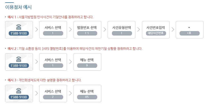 이 화면은 ARS를 어떻게 이용하면 되는지 구체적인 예시를 보여주는 것입니다. 예를 들어 민사사건의 재판 날짜가 궁금할 때는 어떤 순서로 번호를 눌러야 하는지, 또 개인회생 제도에 대한 설명을 듣고 싶을 때는 어떤 번호를 눌러야 하는지 친절하게 설명되어 있네요. 전화를 걸기 전에 내가 어떤 정보가 궁금한지 미리 정하고 어떤 번호를 눌러야 하는지 확인해두면 훨씬 더 쉽고 빠르게 정보를 얻을 수 있을 것 같습니다.
