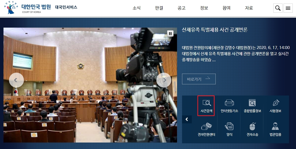 만약 내 사건이 검찰 단계를 지나서 법원으로 넘어갔다면, 이제부터는 다른 홈페이지로 이동해야 합니다. 바로 '대법원' 홈페이지인데요. 형사사법포털이 아니라, 재판과 관련된 모든 정보는 바로 이곳 '대한민국 법원' 홈페이지에 모여 있습니다. 인터넷 검색창에 '대법원'이라고 검색해서 들어가시면 되고, 여기서는 재판 날짜는 언제인지, 재판 결과는 어떻게 되었는지 등을 상세하게 확인할 수 있습니다.